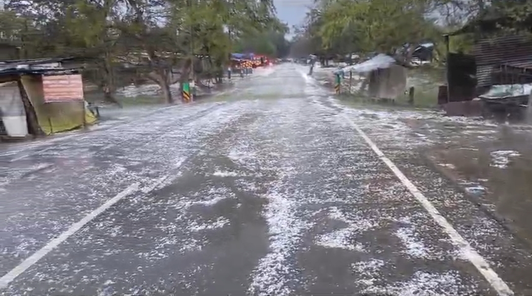 इतनी भरी ओलावृष्टि कि सड़क ही सफेद हो गई ….